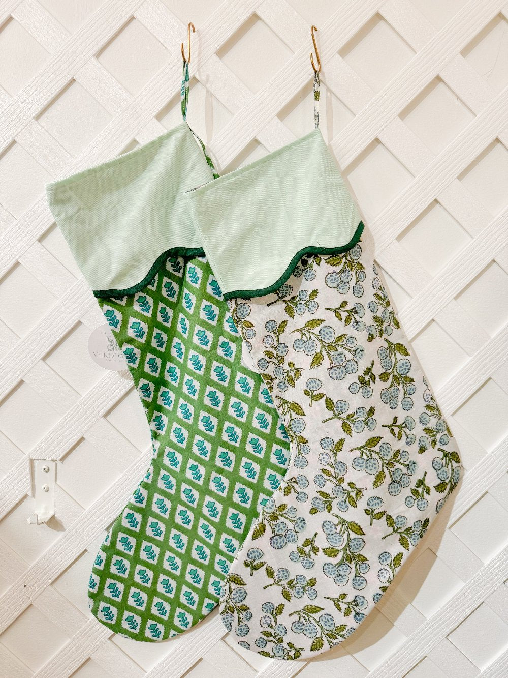 Verdigris' Block print Stocking offers a playful and timeless touch to your holiday decor.