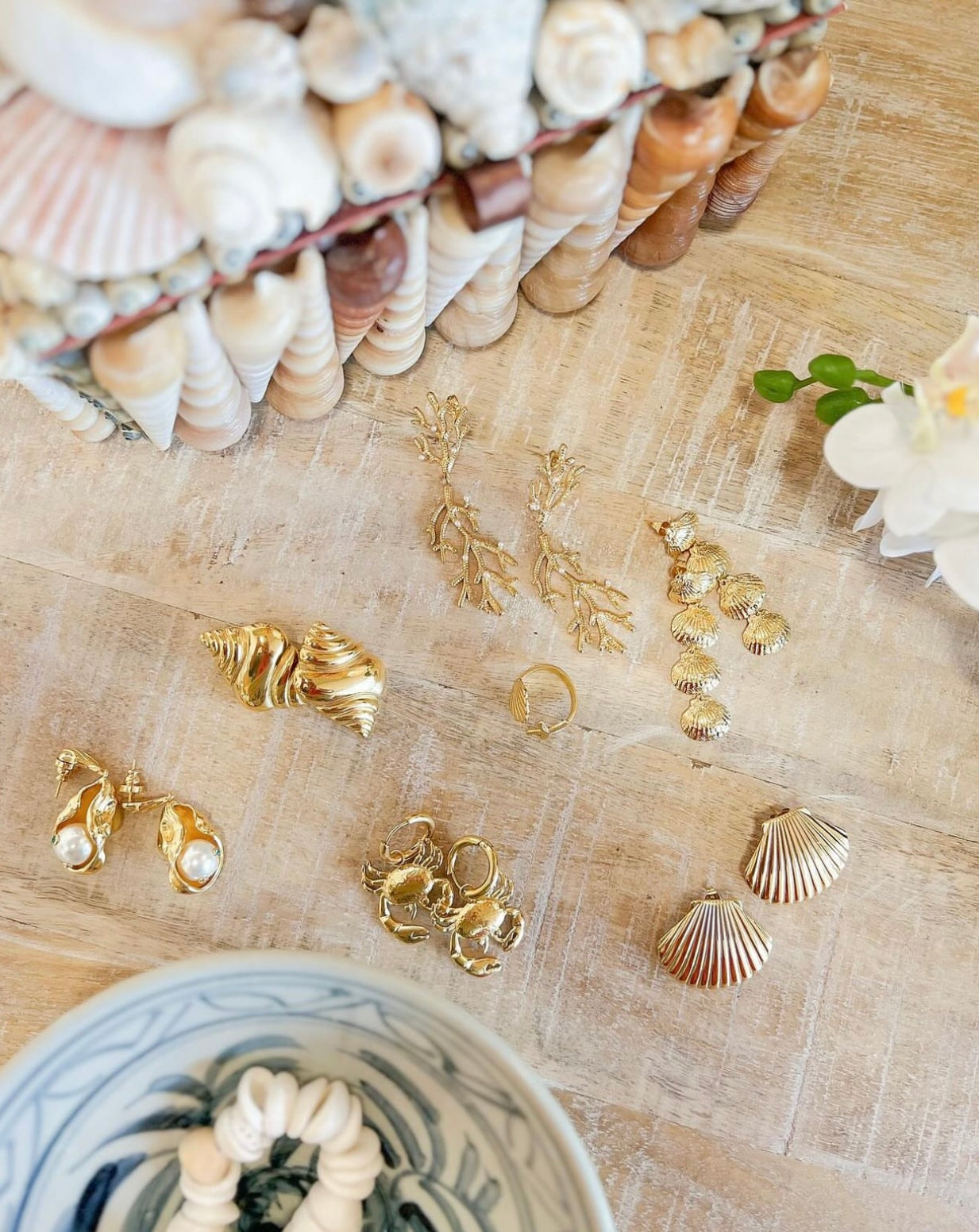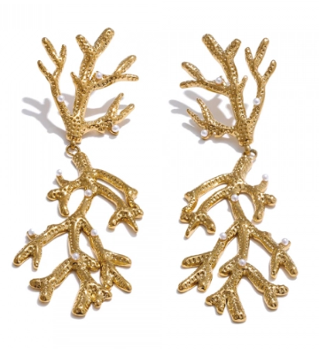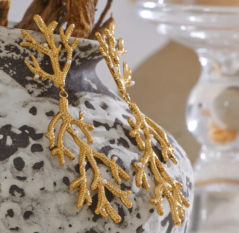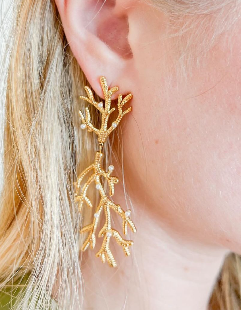 Take us to the islands with these stunning gold coral and pearl design earrings.