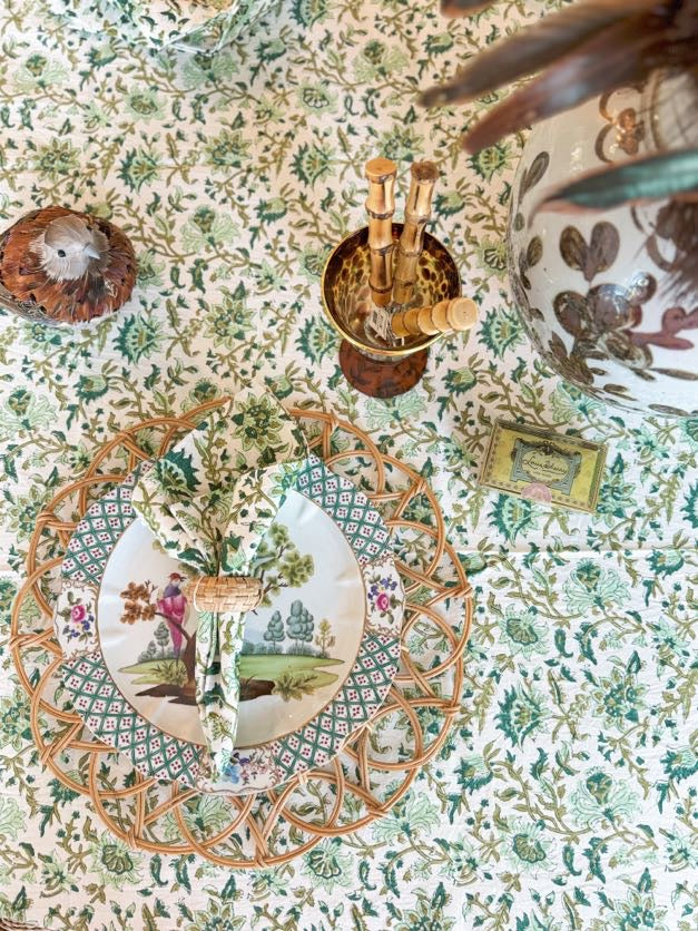 Our Gunnie's Green Tablecloth is hand block printed, showcasing intricate, timeless craftsmanship, made with traditional techniques passed down through generations. Each design is carefully stamped onto the fabric using hand-carved wooden blocks, creating a one-of-a-kind pattern that reflects both artistry and heritage. The vibrant colors and detailed motifs bring a warm, inviting feel to any dining setting, adding an elegant yet cozy touch to your table. Perfect for special occasions or everyday use, this tablecloth is a beautiful fusion of culture, nature, and style, elevating your home with a handcrafted touch.