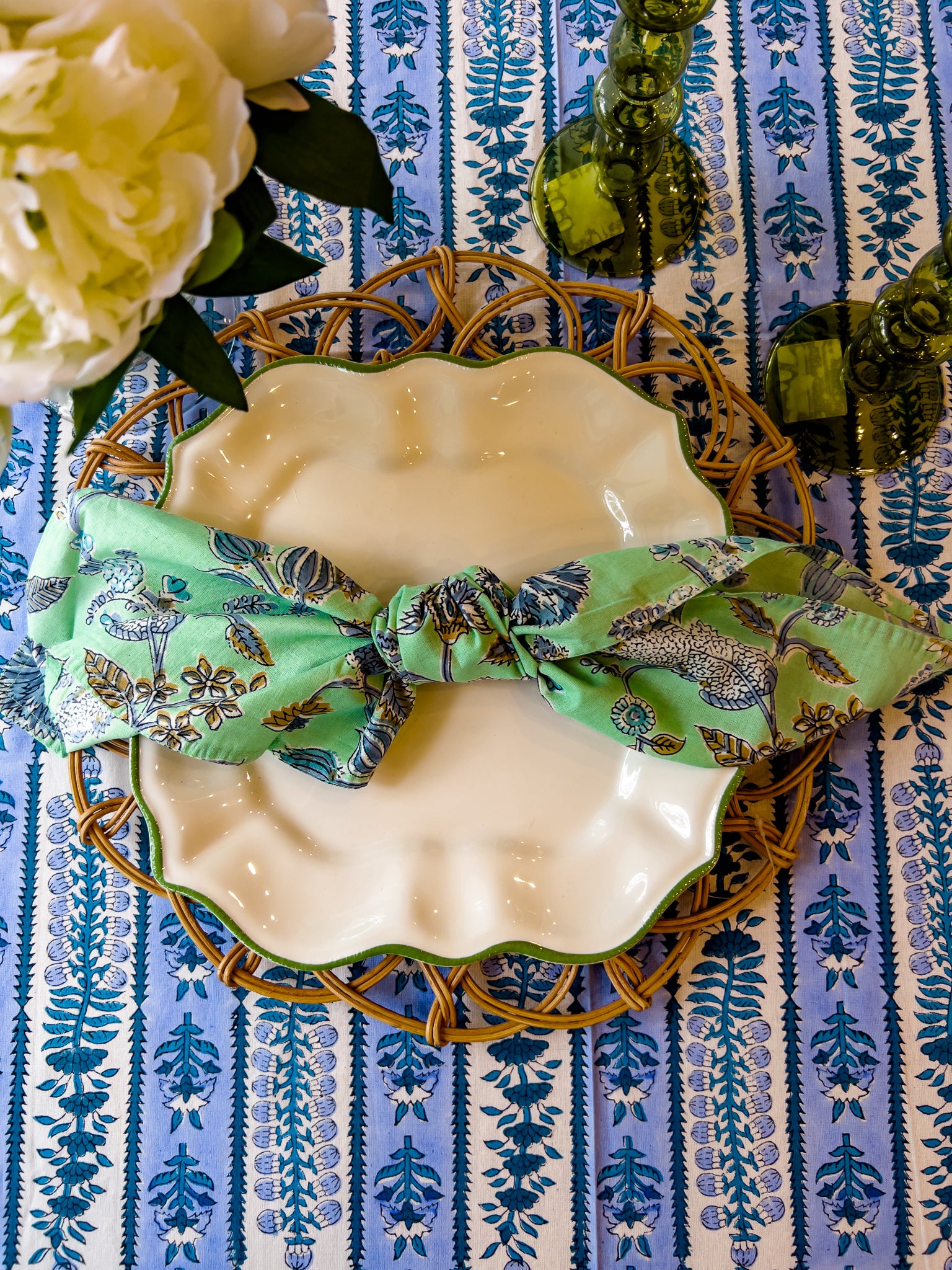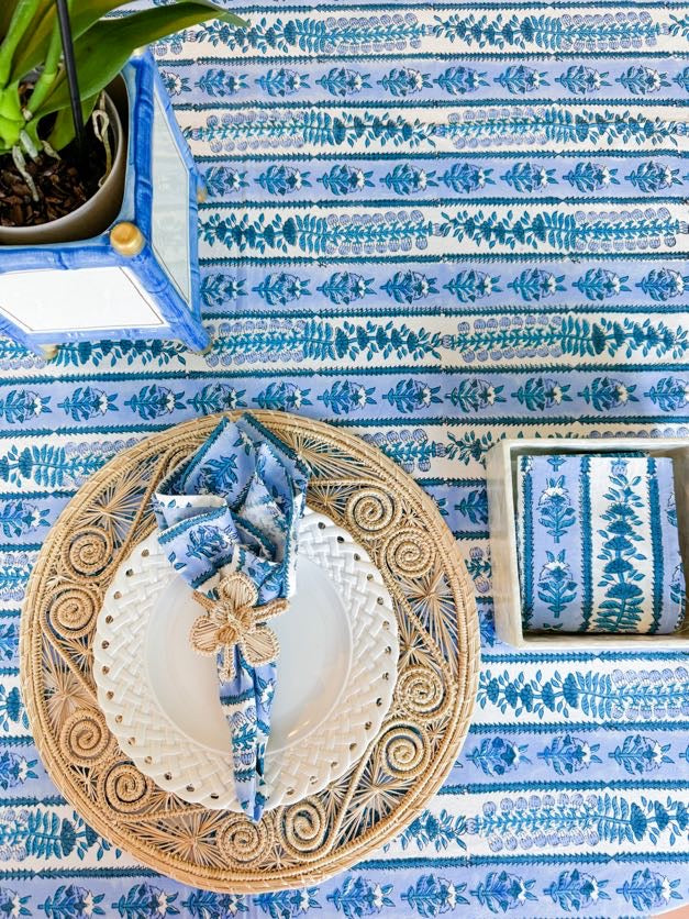 Our Isle of Trellis Tablecloth is hand block printed, showcasing intricate, timeless craftsmanship, made with traditional techniques passed down through generations. Each design is carefully stamped onto the fabric using hand-carved wooden blocks, creating a one-of-a-kind pattern that reflects both artistry and heritage. The vibrant colors and detailed motifs bring a warm, inviting feel to any dining setting, adding an elegant yet cozy touch to your table. Perfect for special occasions or everyday use, this tablecloth is a beautiful fusion of culture, nature, and style, elevating your home with a handcrafted touch.
