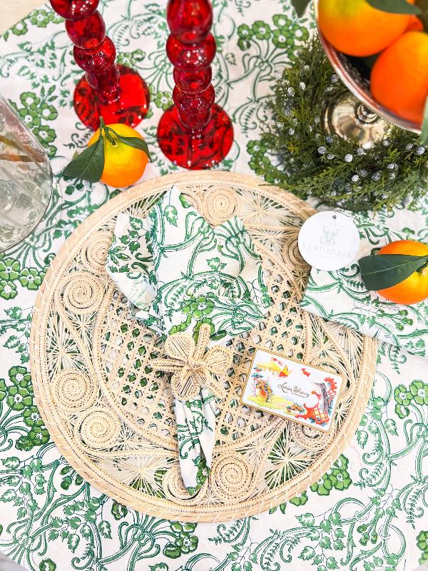 Our Patti Pat's Ivy Tablecloth is hand block printed, showcasing intricate, timeless craftsmanship, made with traditional techniques passed down through generations. Each design is carefully stamped onto the fabric using hand-carved wooden blocks, creating a one-of-a-kind pattern that reflects both artistry and heritage. The vibrant colors and detailed motifs bring a warm, inviting feel to any dining setting, adding an elegant yet cozy touch to your table. Perfect for special occasions or everyday use, this tablecloth is a beautiful fusion of culture, nature, and style, elevating your home with a handcrafted touch.