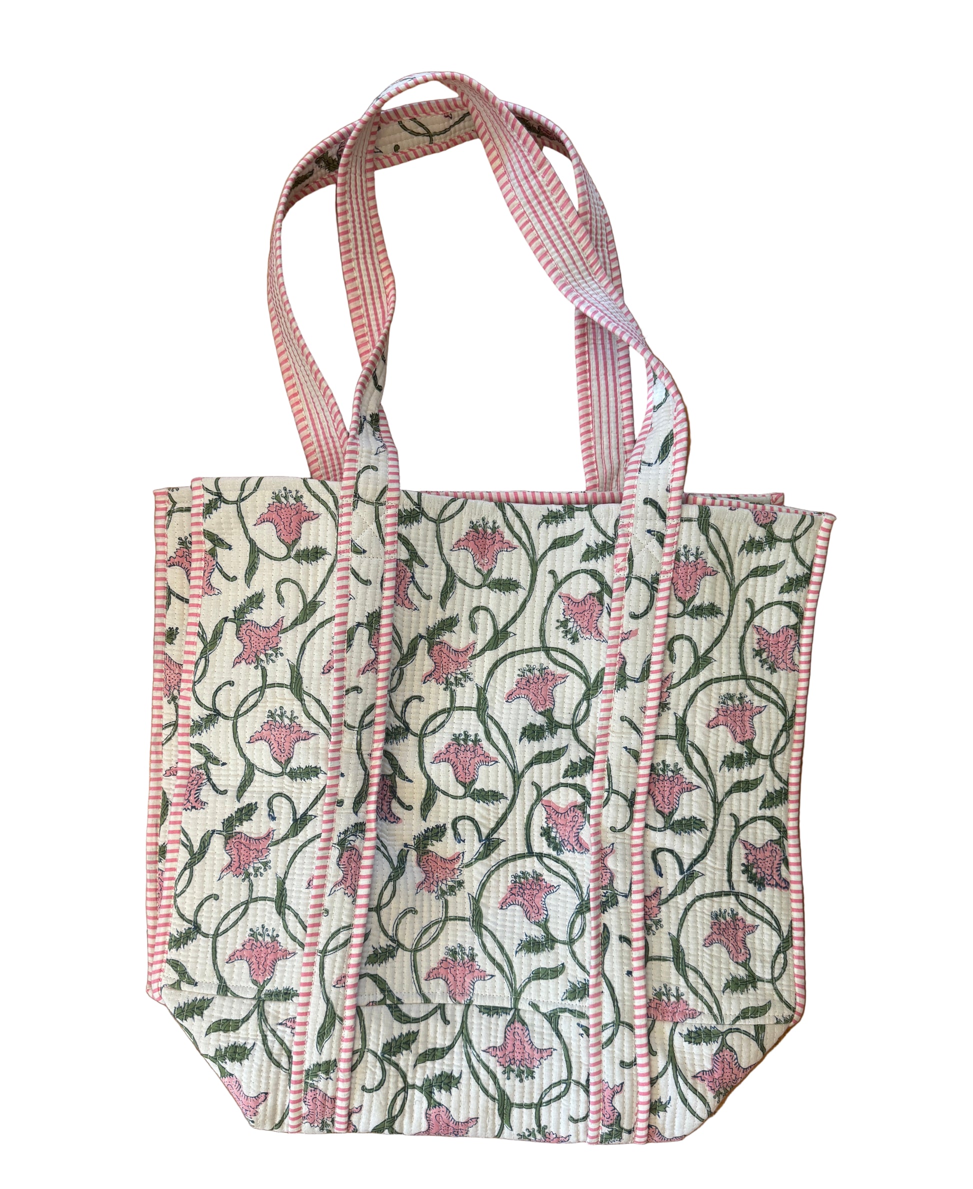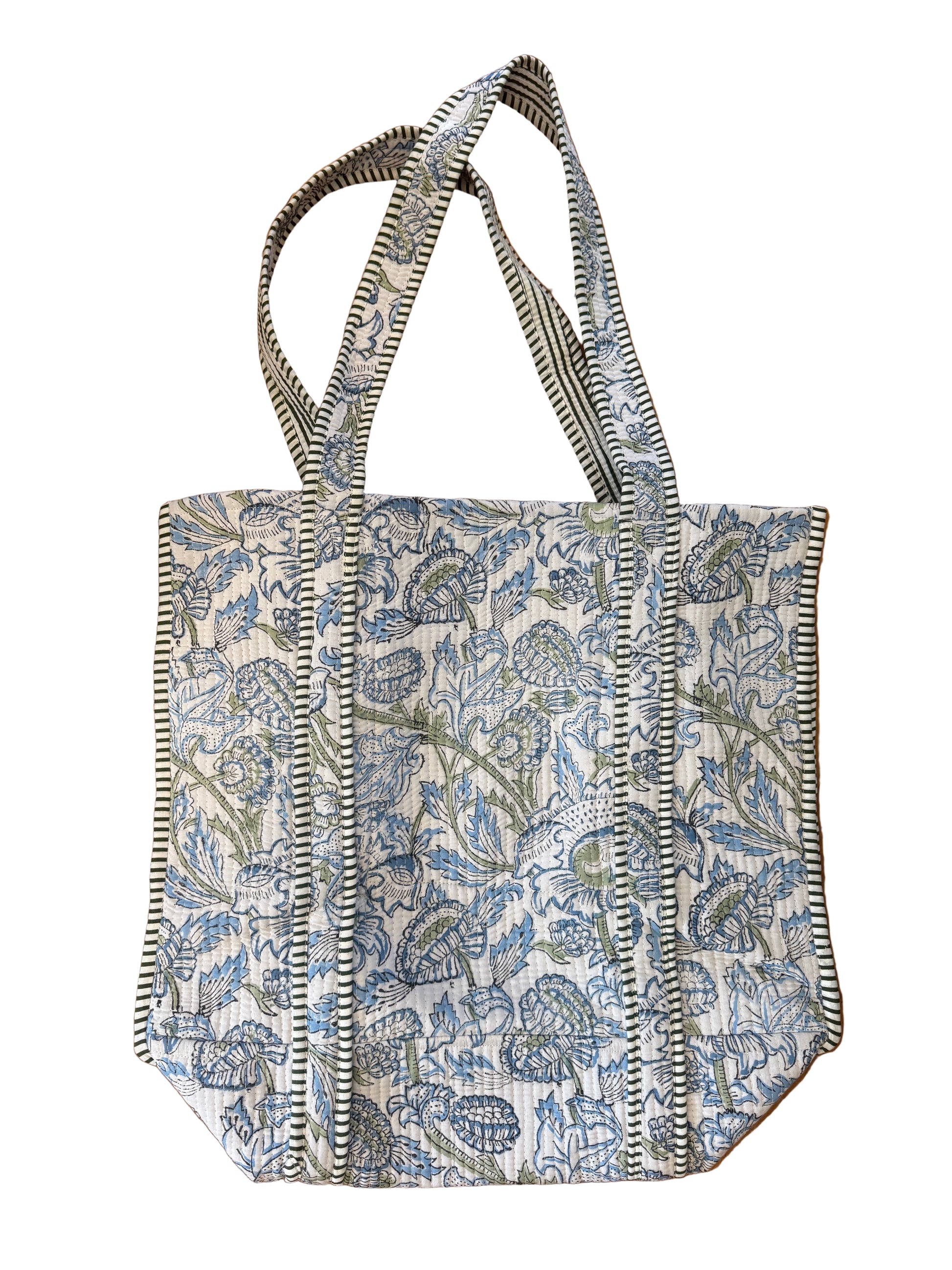 Our Verdigris Block print quilted tote is a collection staple. Pair this tote bag with our best selling set of cosmetic bags! Perfect for all ages. Makes a great work tote, overnight bag & everyday carryall. Lays flat and makes the perfect travel tote.