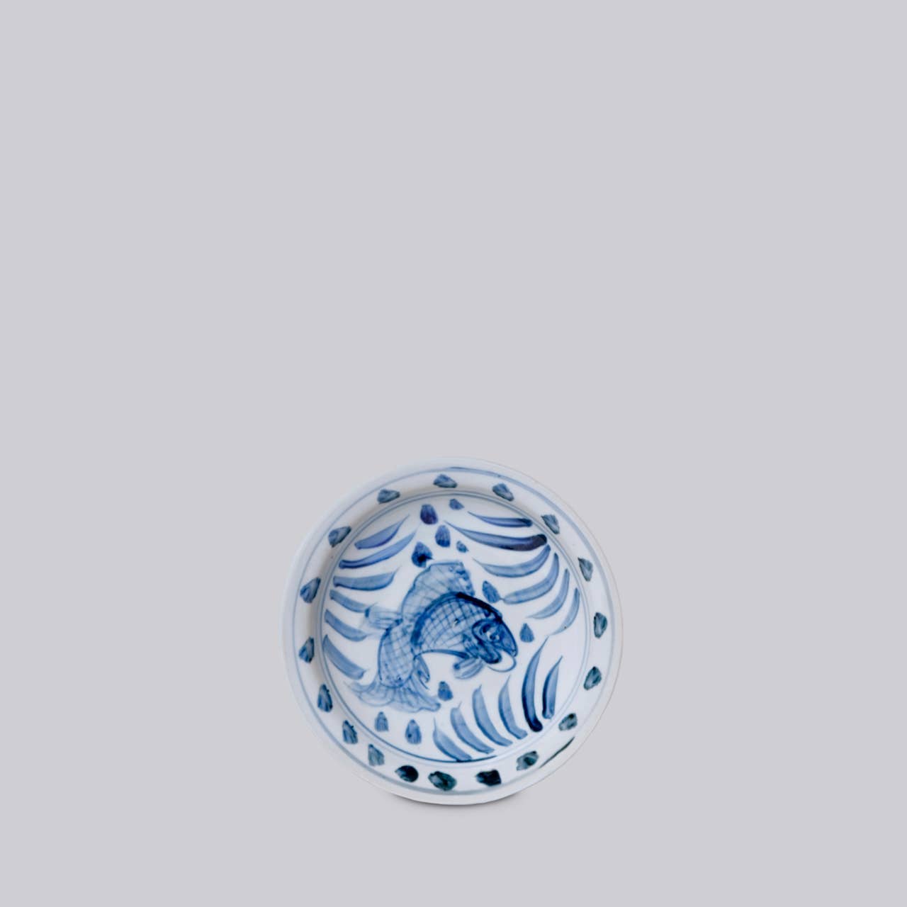 Cobalt Guild offers an assortment of blue and white porcelain vessels from the antiques markets of Jingdezhen, a town long distinguished by imperial patronage. This piece is a small dish with a fish motif, 7" x 1 3/4"